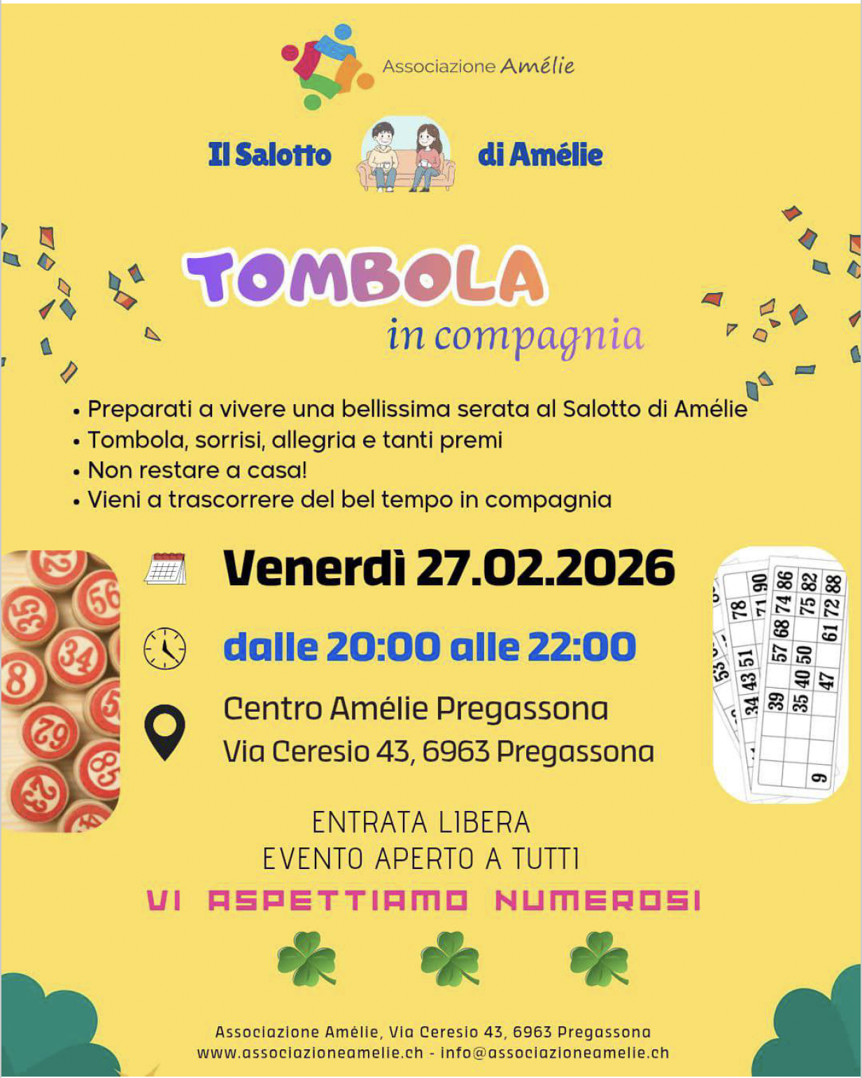 Preparati a vivere una bellissima serata al Salotto di Amélie.Tombola, risate, allegria e diversi premi ti aspettano. Non restare a casa! Vieni a trascorrere del bel tempo in compagnia