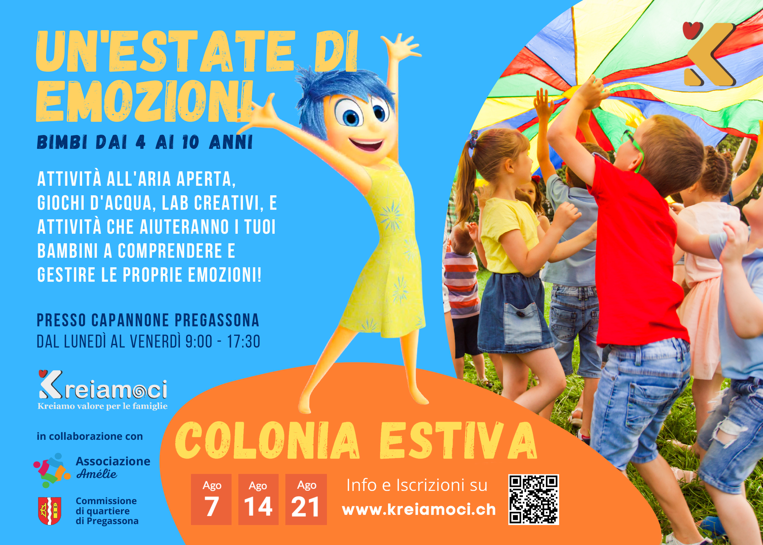 Durante il mese di agosto, grazie all’Associazione Kreiamoci, in collaborazione con l’Associazione Amélie e la Commissione di quartiere di Pregassona, viene proposta la colonia diurna rivolta ai bambini dai 4 ai 10 anni, presso il Capannone delle feste di Pregassona.